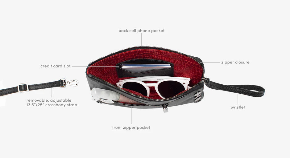 • Can be worn 4 ways: Crossbody, Shoulder Bag, Belt Bag and Wristlet